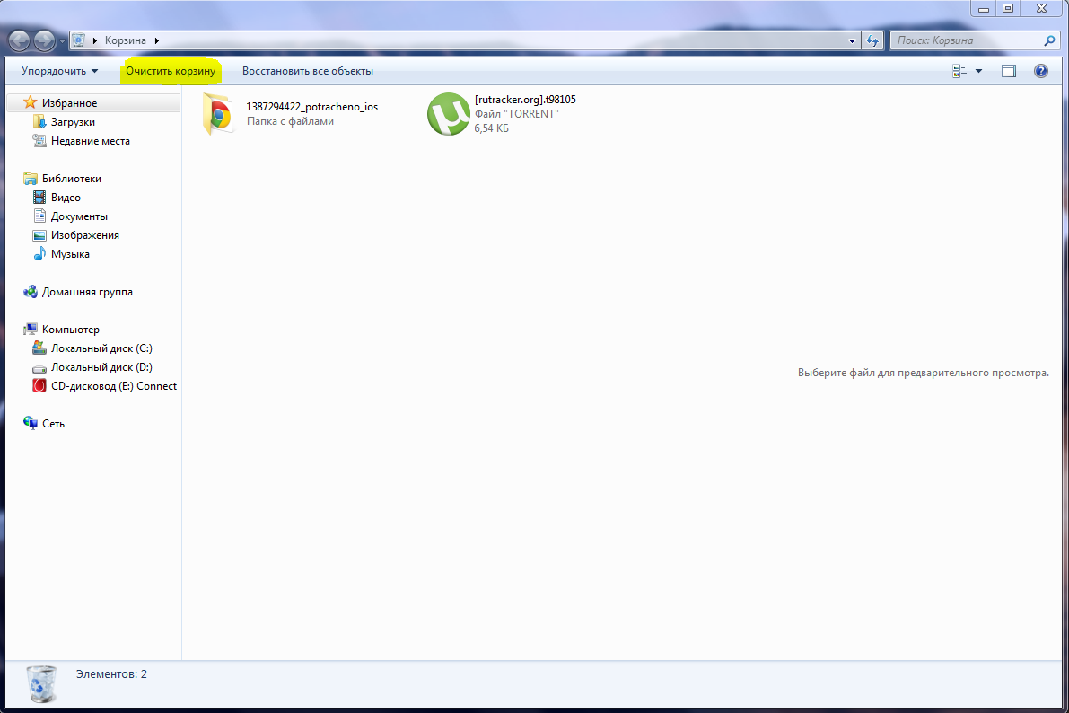 (рис №8) Ну а если вам надо очистить Корзину тогда зайдя в нее нажмите на кнопку "очистить корзину" (см. на рис №9)