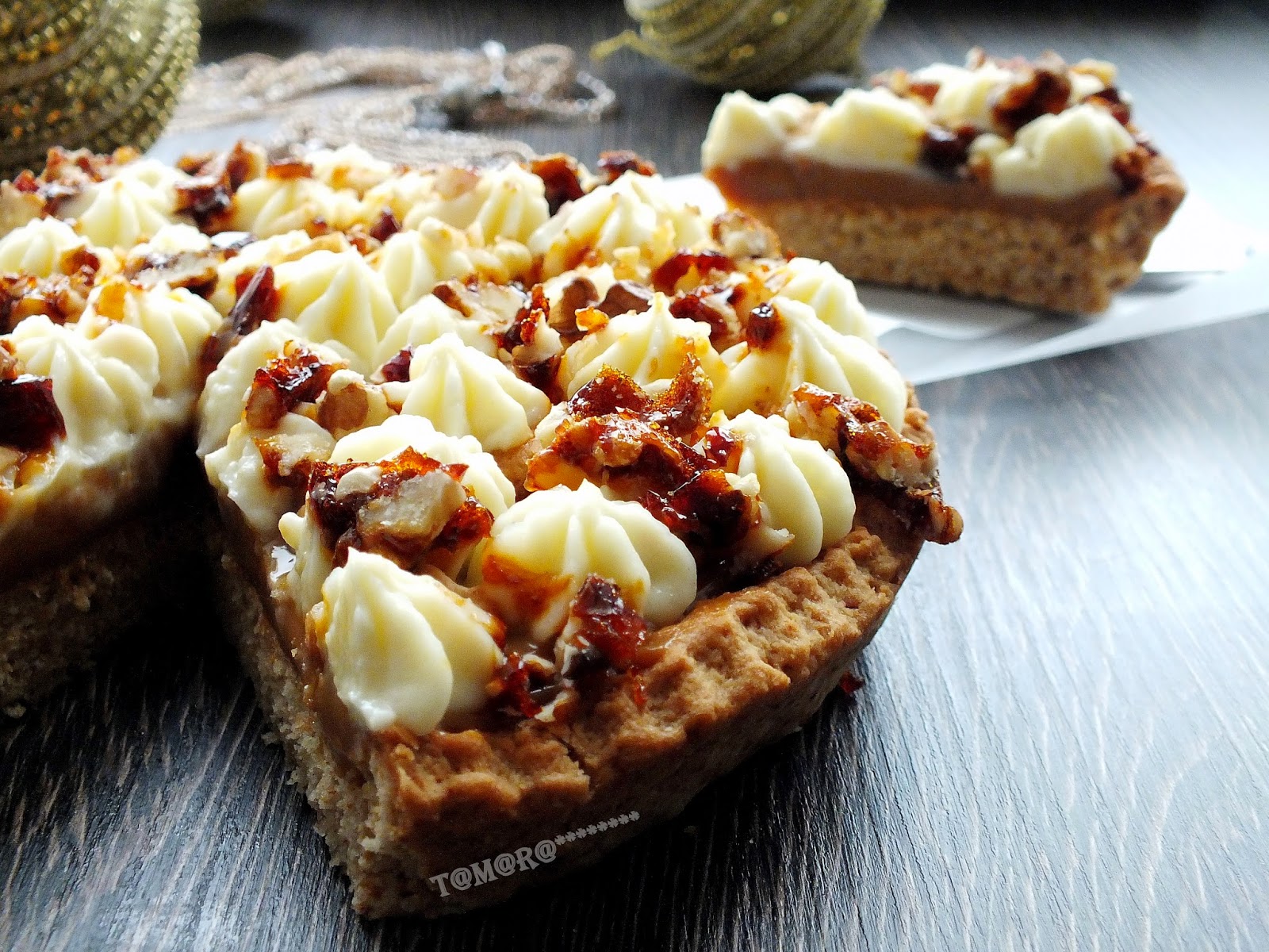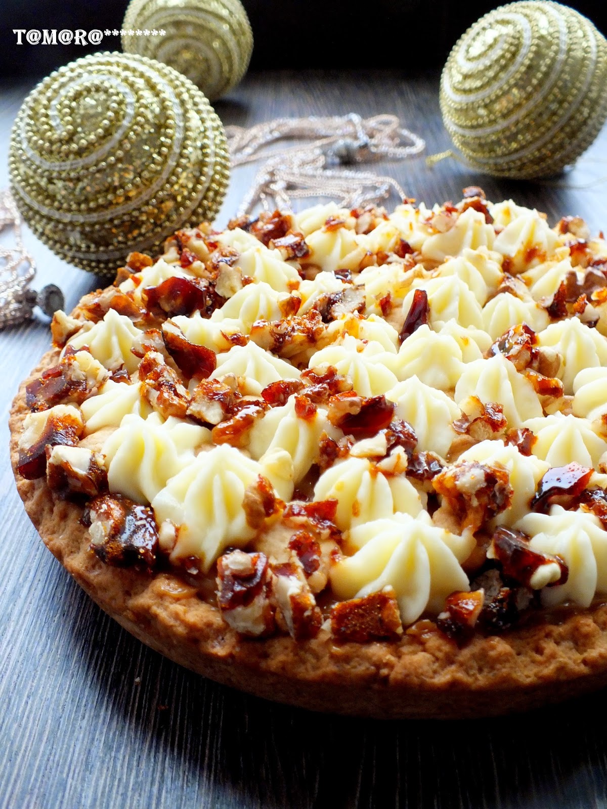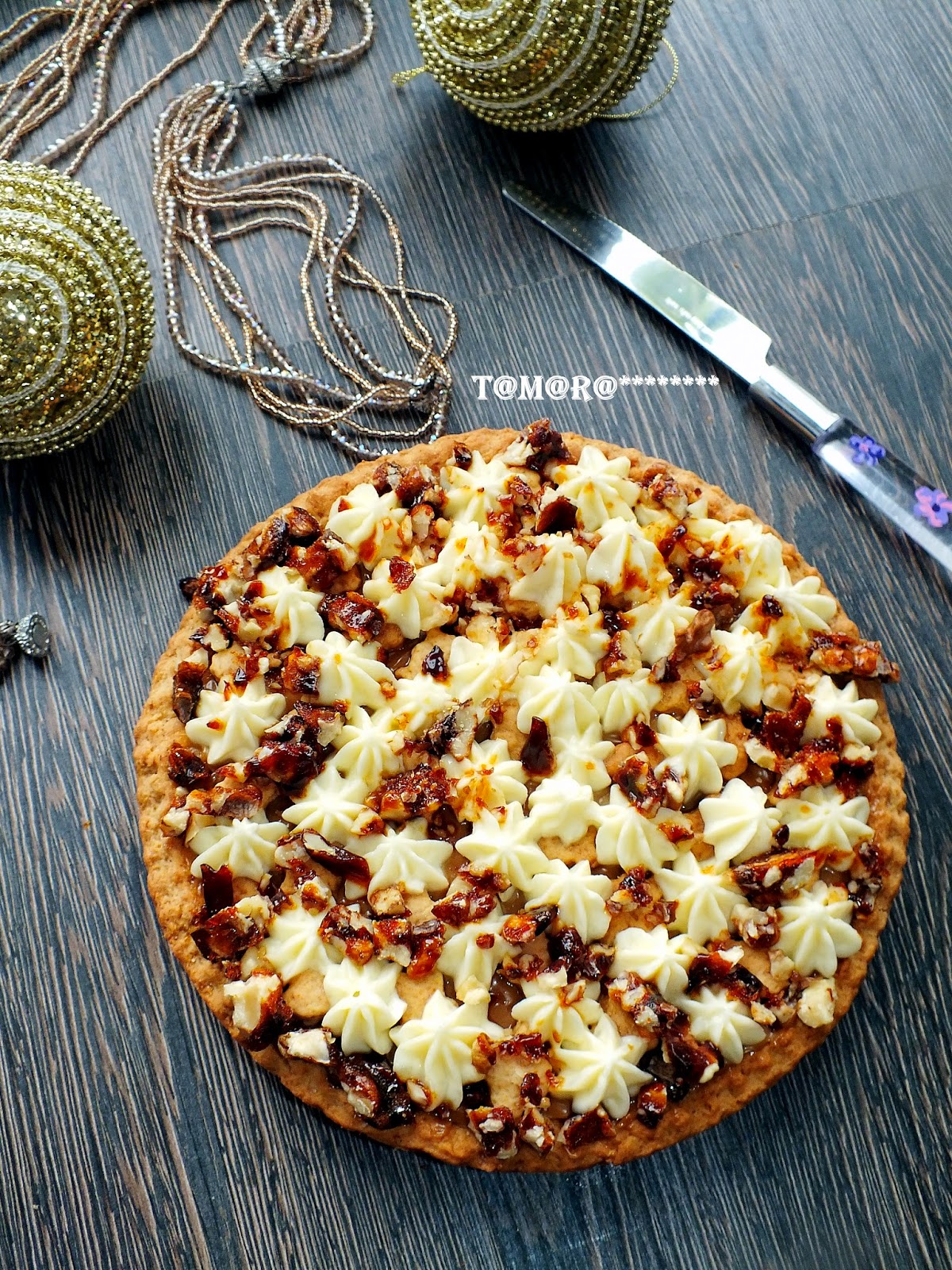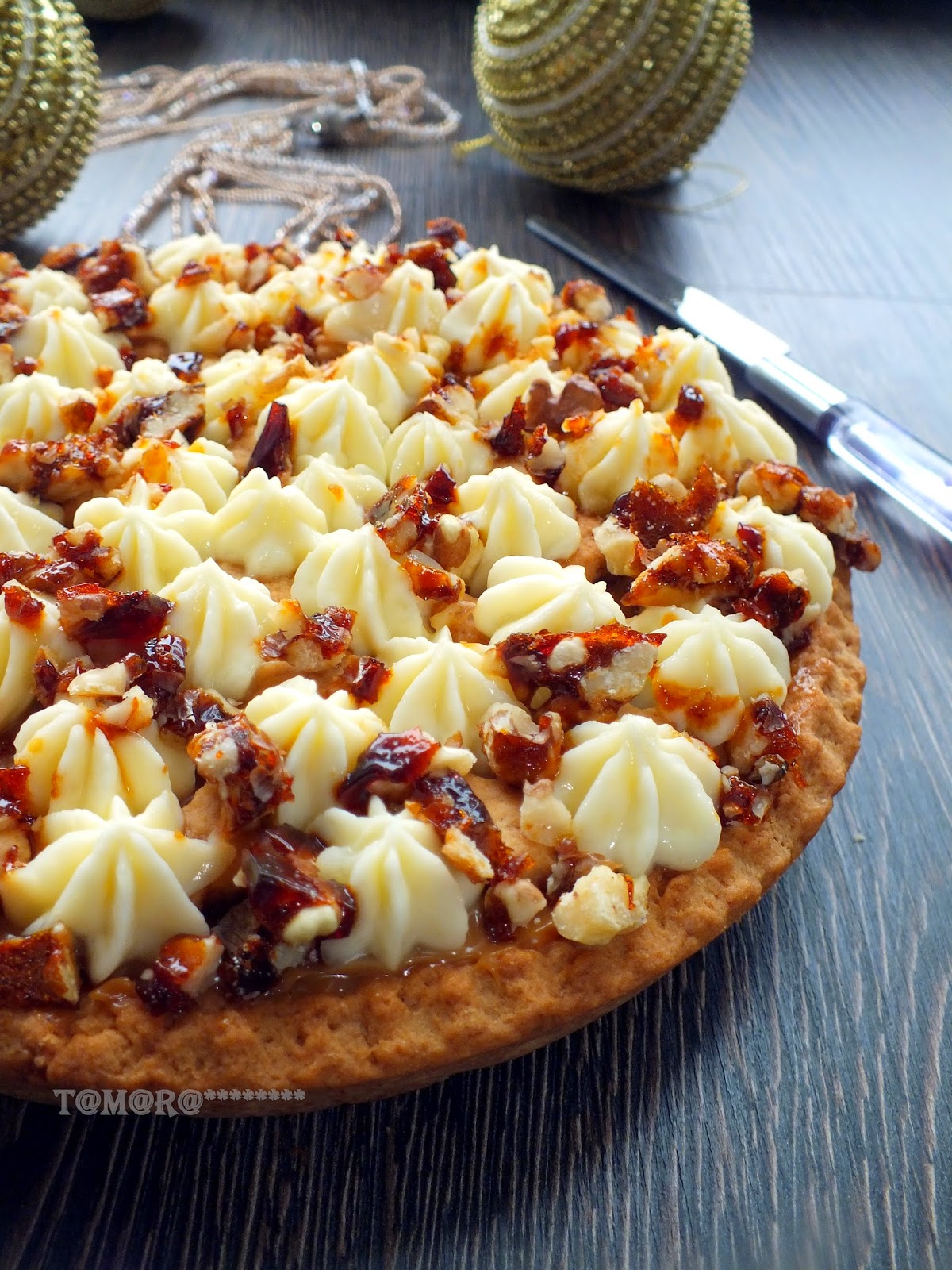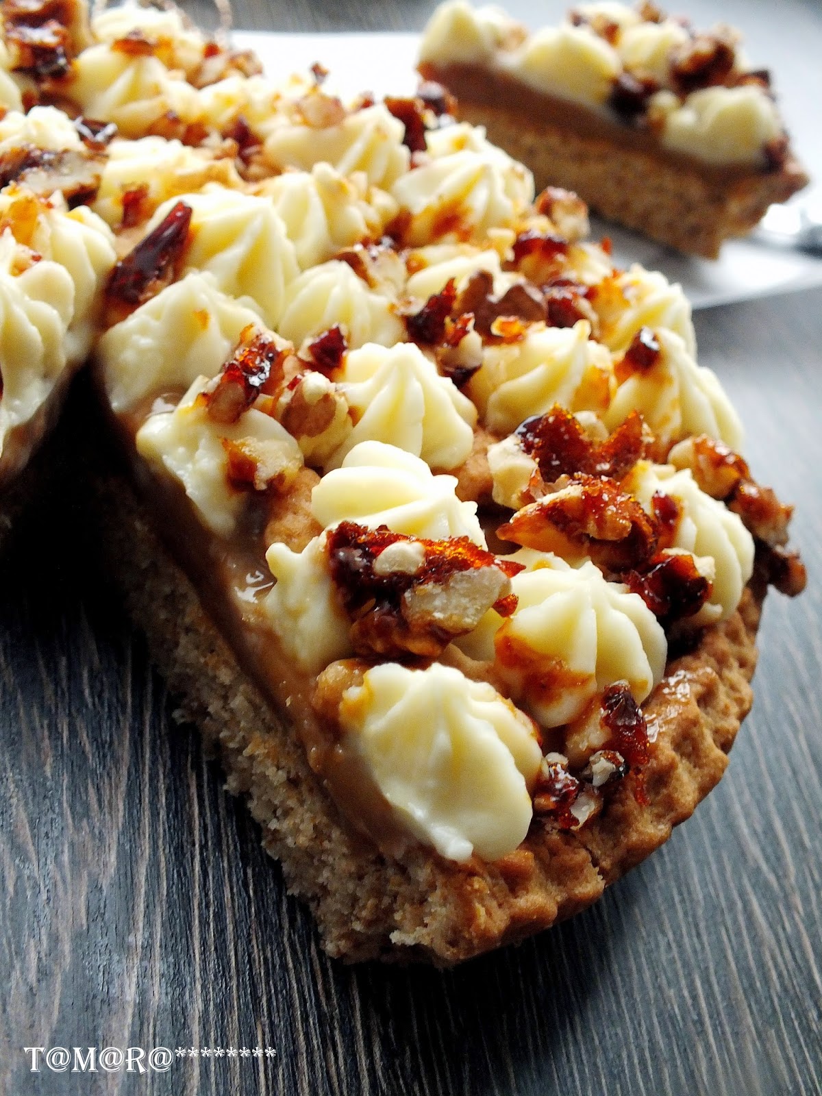 Вкусный и очень симпатичный на внешний вид тортик (пирог) не оставит вас равнодушным. Приготовьте его на праздничный стол и просто к чаю. Замесите эластичное тестоТесто раскатайте в пласт (я это делаю помощи пекарской бумаги)Аккуратно перенесите тесто в форму (23-24 см). Сделайте бортики, обрежьте неровные края. Форму с тестом поставьте в горячую духовку на 20 минут при t-200* до румяного цвета. Обрезки теста скатайте в шар и опять раскатайте. Нарежьте произвольно на кусочки. Их тоже нужно будет испечь (я ставила в духовку сразу с тестом в форме) Пока печется основа, 60 гр коричневого сахара растопите на огне, превратив тем самым ее в карамель Орехи выложите на бумагу и залейте горячей карамельюОстудите и порубите ножом на кусочкиКорж по готовности остудите, намажьте слой вареного сгущенного молока, наверх уложите испеченные кусочки теста Сметану смешайте с сахаром и отсадите на верх пирога при помощи кондитерского мешка. (Небольшой совет: если у вас нет в продаже сметаны 40%, вы можете взять сметану 20%, как это сделала я. Я взяла чистый кусок марли, свернула ее в три слоя, выложила туда сметану и подвесила ее на кухонный кран часа на 3 - лишняя жидкость стекает, в марле остается густая сметана) Сверху посыпьте карамельными орехами.Приятного чаепития!