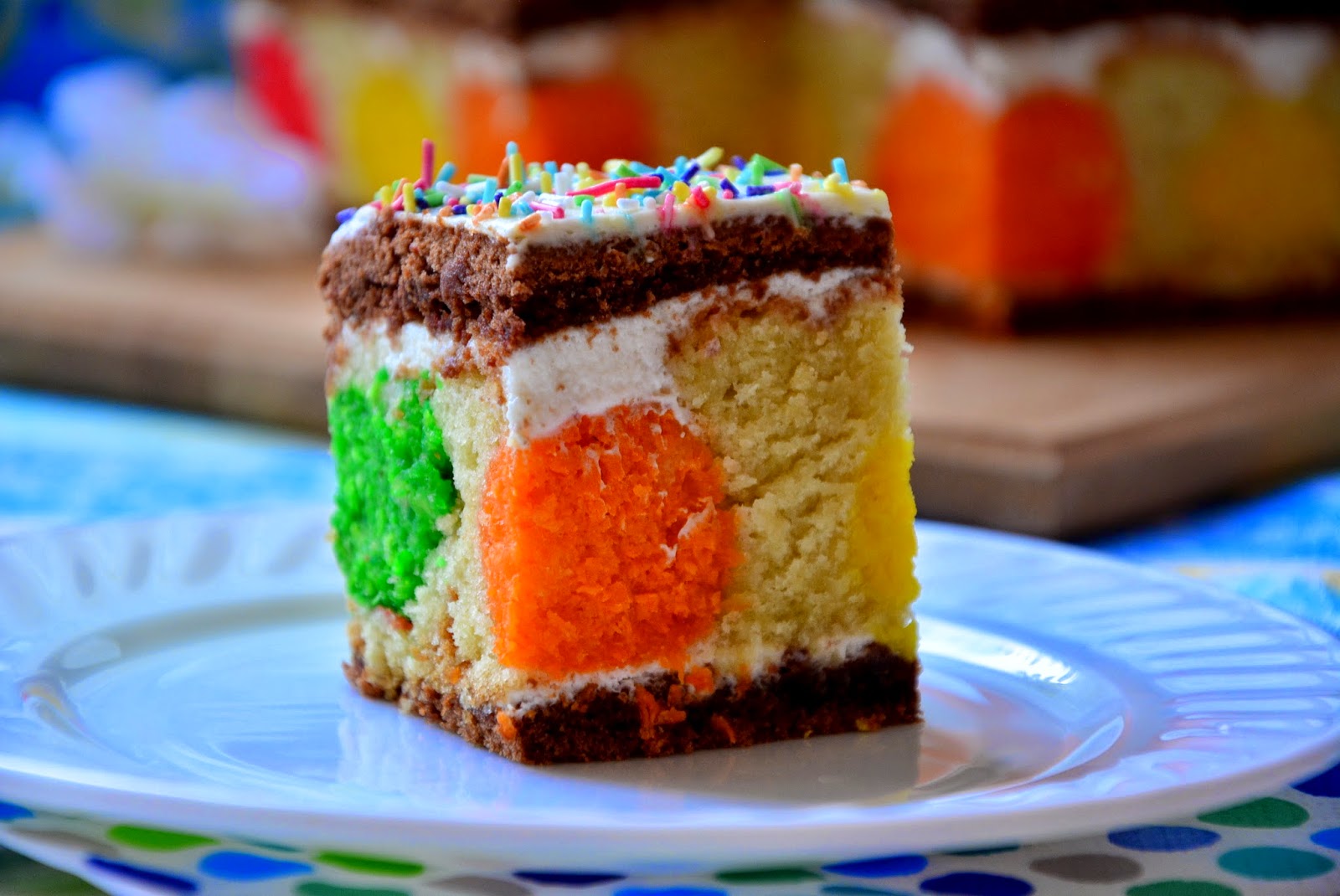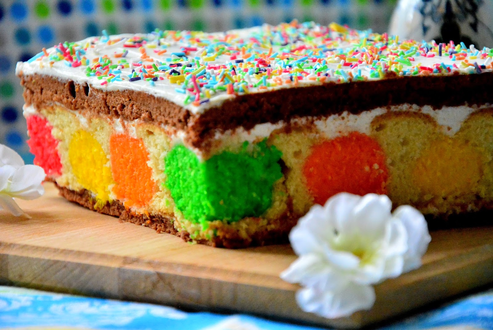 ПЛЯЦОК — это кондитерское изделие, популярное в Западной Украине и Польше, что-то среднее между тортом, пирогом и пирожным. Как правило, его пекут в прямоугольной форме. Весьма характерным является порционная подача пляцка, и в этом случае поражает воображение срез. Он яркий, многоцветный и замысловатый, благодаря разнообразным слоям, начинкам и кремам. Кроме того, это действительно праздничная выпечка. Вкус пляцка — вкус праздника! Не могла пройти мимо, увидела рецепт в социальных сетях и вот сегодня уже его воплотила в жизнь.  Творожную массу поделим на 4 части. В каждую часть добавим по 20 гр разноцветной кокосовой стружкиСлепим по 4 шарика одного цвета и уберем в морозилку на 30 минутГотовим тесто. При помощи миксера растираем мягкое сливочное масло с сахаром. Вбиваем 3 яйца и 1 белок. Затем добавляем сметану. Всыпаем просеянную муку с разрыхлителем.Тесто делим на две части: 1/3 и 2/3В 1/3 теста добавляем какао-порошок (обязательно просеиваем)Выпекаем корж в форме 20*20, при темпер. 180* 25-30 минут. По готовности выкладываем на решетку, даем остыть и разрезаем на 2 частиСледом в ту же форму выкладываем белое тесто. Достаем кокосовые шарики из морозилки и укладываем их в тесто. Выпекаем 35-40 минут при темпер. 180*. По готовности даем выпечке хорошо остыть.Крем делается очень просто. Взбивается сметана с сахарной пудройСобираем пляцок. Первый корж - шоколадный, промазываем кремомСледом укладываем белый корж, опять промазываем сметанным кремом. Завершающий шоколадный корж, также сверху промазываем кремом. Обрезаем неровные края. И украшаем кондитерской посыпкой. Даем пропитаться часа 2 в холодильнике. Приятного аппетита