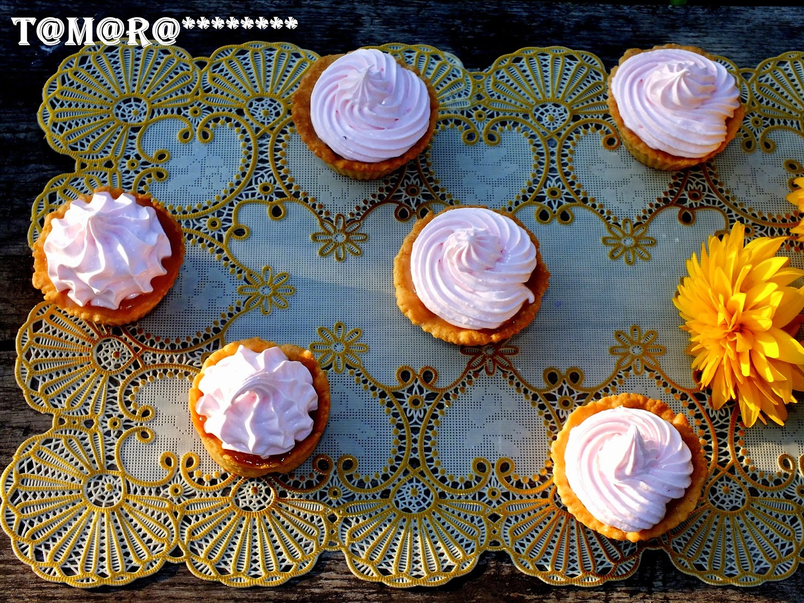 По готовности корзиночки остудить и наполнить яблочным пюре, сверху сделать шапочку из белкового крема.