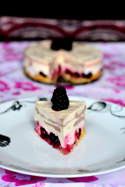 Предлагаю приготовить вкусный, нежный, сливочный чизкейк. Поднимите себе настроение в хмурый день чашечкой кофе с этим десертом.  В чашу выложить крошку из орехов и хлопьев, мягкое масло, сахарную пудру, цедру с одного апельсина. Замесить тесто (если потребуется ввести ложку муки)Тесто распределить по дну разъемной формы (16 см). Поставить в горячую духовку на 180*, выпекать 10 минут. По готовности дать остытьТем временем в ковшик вылить холодные сливки, высыпать туда желатин, размешать. Поставить на маленький огонь и довести до кипения, мешая венчиком, но не кипятить! ОстудитьВ чашке смешать творожный сыр, пастообразный творог, сахарную пудру и остывшие сливки1/3 часть крема отложить в другую чашку и добавить просеянное какао, размешатьНа остывший корж выложить слой ягоды (у меня ежевика)(вкуснее будет со свежей)Затем часть белого крема, на него шоколадный кремТаким образом выложить весь крем. Можно сделать разводы деревянной палочкой.Убрать чизкейк в холодильник до полного застывания. У меня через час уже был готов. Украсить ягодой и можно подавать!Приятного аппетита!