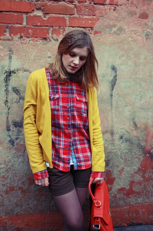Образ дня сегодня немного неформальный и рок-н-рольный с оттенком гранжа. Клетчатая рубашка и шорты в компании с темными колготками - классическая английская схема уличного стиля. Тут можно экспериментировать до невозможности. Клетка может быть разной, как впрочем и шорты. Англичанки очень любят джинсовые голубо-синие шорты, и чтобы ботинки, и гольфы желательно. Этот наряд смотрится очень круто. Попробуем?