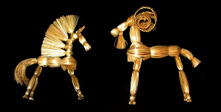 Одно из древнейших народных ремёсел - плетение из соломки.У нас на Беларуси из последнего снопа соломы делали удивительные игрушки-обереги, которые должны были помочь пережить тяжёлую зиму, вселяли надежду на благополучие, здоровье и укрепление рода. Делали жаворонков, барашков, лошадок,козликов. Высоко порящие над полем , жаоронки всегда радовали своей журчащей песенкой и эта радость прихордила в дом с соломенной птичкой. Ночь, которая ассоциировалась с о страхами, болезнями, нечистью - отступала перед утренней песней жаворонка. Но вершина народного мастерства по соломоплетпению это соломенные царские врата. На Беларуси их было найдено всего три..   Главная часть церковного интерьера традиционно вырезалась из дерева, золотилась и украшалась драгоценными камнями и иконами. . Врата из соломы горят как золотые. А маленькие кусочки ткани синего, красного цвета выглядят на соломенном плетении как настоящие драгоценности. Что вкладыввали белорусские крестьянки в свою работу - нетрудно догадаться. Просили здороья, удачи, благополучия. Первые найденные врата, привезенные их экспедиции выглядели грудой грязных, разрозненных плетёнок, но это был хороший материал для изучения. Реставрацию поручили старейшей мастерице по соломоплетению Лось Ларисе Николаевне - моей маме. Ей помогала моя сестра Алёна Лось. Три экземляра врат, найденных на территории моей страны, отличаются друг от дуга. Одни находятся в Гродно,другие в Раубичах и в Государственном музее а Минске Царские врата из соломки - уникальное явление в мировой культуре. Лось Лариса Николаевна повторила все врата после реставрации. Одни из них " выкупил" как 30000 экспонат Государственный музей . Пишу "выкупил" в кавычках, потому что уже прошло два года после этого события, а деньги музей так и не выплатил. Нету.  На снимке слева направо моя премянница Марыся Лось,моя сестра Алёна Лось, брат Алесь Лось ,Н:аталья Лось( стало быть - я) и мой муж. Виктор Довнар. В центре наша мама художница Лось Лариса Николаевна, член Союза Художников, старейший мастер по соломоплетению в Беларуси. Сейчас ей ей 84 года.Она почти не видит. Но жаворонков делает по-прежнему.