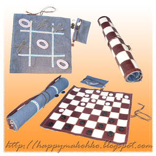 Итак, мой блог - это моя территория счастья, все, что я делаю руками - моя бесконечная радость и счастье. Первый пост посвящается моему любимому сыночку Максиму. Доска для шашек, скручивается в трубочку, удобно брать с собой в продленку. Обратная сторона - поле для игры в крестики-нолики. Доска сшита из кожи, шашки - пуговицы (чтобы можно было безболезненно восполнить потери "шашек") Крестики, нолики из ткани.
