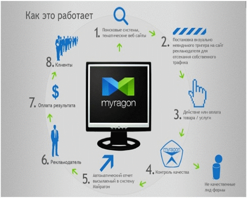 Компания – крупнейший агрегатор партнерских программ с оплатой за действие (Pay Per Action) в Рунете. Привлечение клиентов по модели оплаты за действие (Pay Per Action) – непрерывный процесс получения целевого трафика, при котором рекламодатель оплачивает только тот результат, который ему необходим: продажи, регистрации, инсталляции, скачивания, заполнение различных форм и многое другое. Рекламодатель может самостоятельно определять действия и их стоимость. Myragon ежедневно помогает огромному количеству рекламодателей и вебмастеров объединяться для взаимовыгодного сотрудничества. Веб-мастерам Myragon предлагает выгодно монетизировать свой трафик, размещая предложения рекламодателей на своем ресурсе. Рекламодатели получают возможность оплачивать только интересующие их действия посетителей сайтов, а не клики или показы. Myragon – это десятки миллионов показов рекламы в сутки, миллионы посетителей, тысячи клиентов, пришедших к рекламодателю, тысячи вебмастеров и сотни тысяч регулярных выплат.