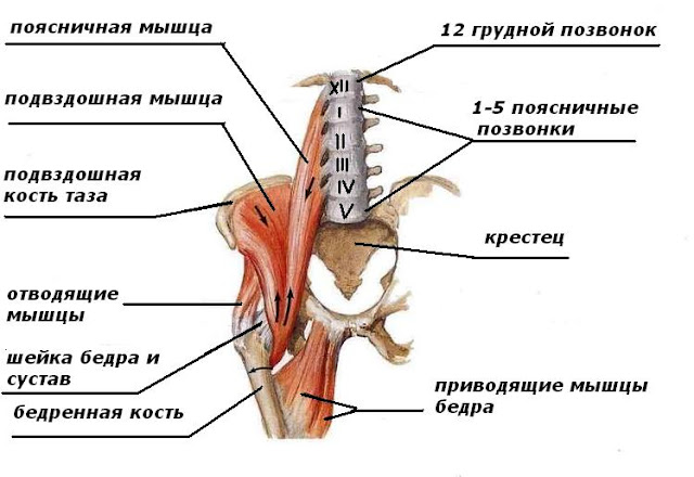 Во-вторых, если внимательно прочитать все вышеизложенное, то можно заметить, что с этой мышцей связаны: грудо-поясничный переход, пояснично-крестцовый отдел позвоночника, почти все связки таза и тазобедренный сустав. Поэтому любые проблемы в этих отделах организма отражаются на пояснично-подвздошной мышце, и наоборот, любой спазм этой мышцы оказывает негативное влияние на состояние связанных с ней органов.
