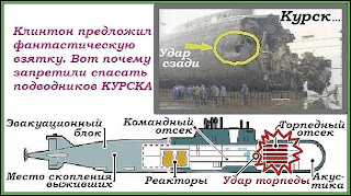 Факты же говорят о другой версии. В районе учений находились две американские подводные лодки: « Мемфис» и «Толедо». Это не новость. Подводники говорят, что когда противник садится «тебе на хвост», то приходится удирать, отстреливая через специальные аппараты приборы, имитирующие подводную лодку. В случае же с «Курском» глубина моря была небольшой (108 метров, для примера - длина АПЛ «Курск» примерно 150м), где тут разминуться трем махинам. Поэтому была велика вероятность столкновения, что и произошло – столкновение американской пл «Толедо» и АПЛ «Курск». У командира другой американской пл «Мемфис» не выдержали нервы, и он выпустил торпеду (в постоянной охоте подводных лодок друг за другом такое может случиться) по «Курску».
