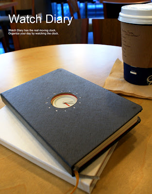 Органайзер Watch Diary от Вонджун Сонга имеет следующие особенности - через все страницы, включая лицевую часть обложки и исключая заднюю её часть, проделаны отверстия для часов, часов - которые крепятся к задней части обложки.
