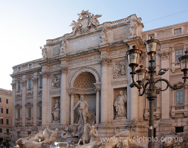 Самый красивый фонтан в городе, а может и во всем мире, это фонтан Треви в Риме(Fontana di Trevi). Это еще и самый большой фонтан в Риме, его высота почта 26 метров. Архитектура Барокко и Рококо во всем ее великолепии. Если вам приедет идея сделать фото фонтана Треви, имейте в виду, толпа туристов тут всегда такая, что становится немного страшно, потому что фантазии футуристов о перенаселении планеты, голоде и войне за ресурсы уже не кажутся невероятными. Придется либо приходить рано-рано утром, либо залазить повыше (я так и сделал). Фотография, которую видите, сделана методом "залезания на мусорный бак", утренние фотографии фонтана Треви показались мне слишком мрачными, как всегда "повезло" с погодой.