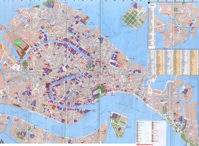 Вот отсканировал вам туристическую карту Венеции. Почему вам? Потому, что многие пишут что в Венеции очень просто заблудится. Действительно очень много узких улочек похожих друг на друга как две капли воды. Стоя на них вы не видите ничего кроме стен, настоящий лабиринт. Но! Венеция это на 100% туристический город и на каждом шагу буквально на каждом перекрестке нарисованы стрелочки. Их только 2 "Rialto" и "San Marco". Собственно это и есть 2 самые выдающиеся достопримечательности Венеции, так что даже если вы на мгновение потеряетесь, очень вероятно на следующем перекресте уже будете знать куда идти. На туристической карте Венеции эти места отмечены, но я дополнительно обвел их кружочками.