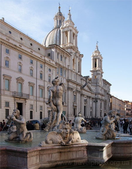 Фонтан Четырех рек был на реконструкции, его на фото мы не увидим. Жаль, Бернини создал фигуру реки Ла-Платы так, что она вытянула руку в защитном жесте в сторону фасада работы Баромини, а фигура Нила и вовсе отворачивается с недовольным видом. Ну не любили архитекторы друг-друга.