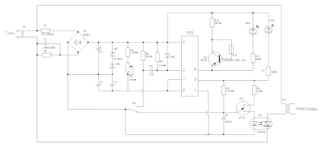 Электрическая схема аппарата нарисована для целей ремонта, по печатной плате. Все аппараты уже подвергались ремонту, поэтому в схеме могут быть ошибки.
