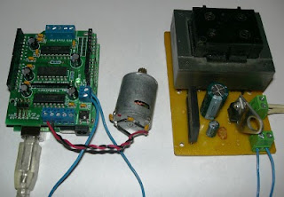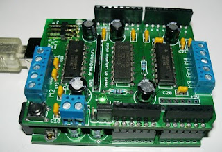2010-12-07 21:59:00 (читать в оригинале)Сегодня, наконец-то, дошли руки идо платы MotorShield для Freeduino. Плата содержит микросхему сдвигового регистра и два драйвера L293. Это позволяет управлять 4 двигателями постоянного тока или 2 шаговыми моторами. Плюс в любом варианте можно подключить две сервомашинки.