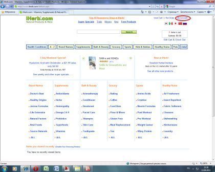 Итак, на рисунок 1( чтобы увеличить рисунок нужно щелкнуть по нему мышкой), вы видите главную страницу интернет-магазина iHerb. Интернет-адрес магазина : http://www.iherb.com. Скопируйте его и вставте в адресную строку браузера и далее следуйте указаниям, описанным ниже.