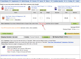 После нажатия кнопки Add to Cart наш товар попадает в корзину, на странице которой мы в центре видим табличку с выбранными позициями(рис.2). Выше, над таблицей демонстрируются товары, которые приобрели другие пользователи , солидарные с вашим выбором. Под таблицей мы видим следущую строчку: New customers: If you have a Referral Email or Coupon Code,enter it here , здесь в окошечке нужно ввести AKO530. Это мой реферальный код. Он дает вновь зарегистрированным посетителям получить скидку в 5$ на свой первый заказ. Более подробно о том, что это за реферальный код, я расскажу в статье о партнерской программе магазина iHerb. Далее нужно нажать кнопочку Update.