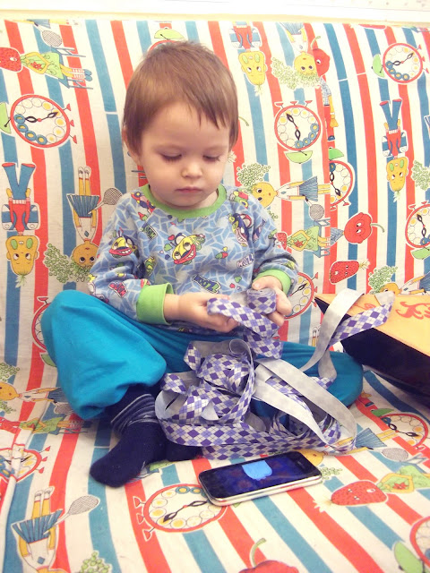 Саше тоже счастье, понравилось ему разматывать рулончик (я наверно раз 10 за вечар его обратно сматывала). А это он бабушек копирует, правда они обычно вяжут или вышивают за просмотром фильма. Саша так смотрел мультик "Бременские музыканты" на моем новеньком телефончике