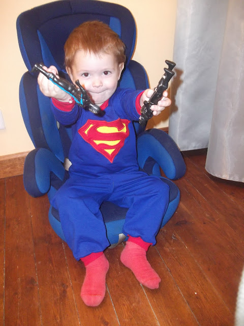 В магазине не оказалось игрушки Супермена, только Бетмен и Человек паук. Поэтому решили, что Суперменом будет Саша. Пришлось ваять костюм сверхчеловека. Я тоже чувствовала себя сверхчеловеком, когда первый!!!!!!! раз в жизни делала аппликацию на машинке, и у меня получилось!!! Спасибо мастер-классу рукодельницы elkin. А вот и Супермен.
