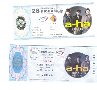 Кстати, автор блога 3 раза побывала на концертах A-HA (в последний раз – в «Олимпийском» - 9 ноября 2010 г – на прощальном концерте группы. Выходя из зала после концерта, я наткнулась на чувака, звонившего по моб. телефону и сообщавшего: «Концерт – бомба!» Была с ним полностью согласна). Прилагаю к посту сканы с билетов и рекламки концертов 2002 и 2003 гг: