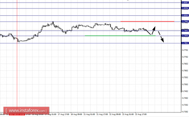 Краткосрочное нисходящее движение возможно в диапазоне 0.7893 – 0.7856, отсюда высока вероятность разворота кверху, пробой уровня 0.7856 будет располагать к формированию нисходящей структуры, здесь первая цель – 0.7802.