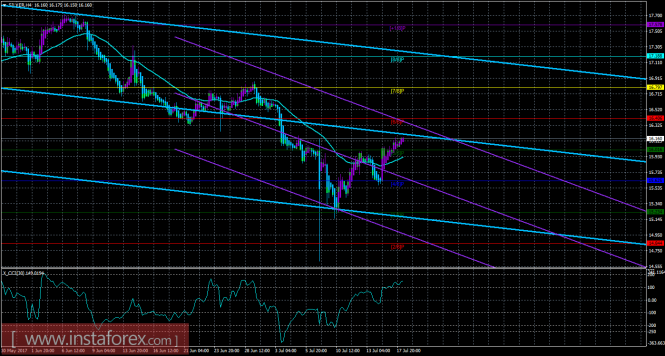 Исходя из анализа серебра 18 июля, следует, что цена закрепилась выше уровня Мюррея «5/8» и продолжает несильное восходящее движение. Старший канал направлен вниз, что свидетельствует о нисходящем направлении движения глобального тренда. Младший канал также направлен вниз, что означает теперь нисходящую тенденцию и в краткосрочном плане. В данный момент цена находится выше мувинга и выше уровня Мюррея «5/8», что делает более вероятным продолжение восходящего движения. Первой целью для движения вверх сейчас является уровень Мюррея «6/8» - 16,406, но открывать длинные позиции сейчас не рекомендуется. Если цена преодолеет этот уровень, то новой целью будет выступать уровень Мюррея «7/8» - 16,797. Скользящая средняя линия направлена вверх, а цена располагается выше нее, что сигнализирует о текущем восходящем уклоне. Ордера на покупку можно будет рассматривать только после разворота наверх любого канала. Шорты станут актуальными только ниже мувинга. Хайкен Аши окрасил последние бары в фиолетовый цвет, что сигнализирует о текущем движении вверх, однако длинные позиции сейчас не актуальны в любом случае. Индикатор CCI находится около уровня 200, что сигнализирует о наличие сильной перекупленности инструмента, ожидается нисходящая коррекция.