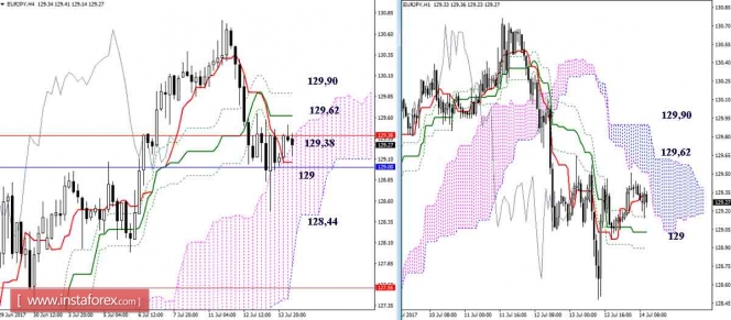 Среди сопротивлений младших таймов сегодня нужно отметить 129,62 (Киджун Н4 + облако Н1) и 129,90 (Фибо Киджун Н4 + облако Н1), дальнейшими повышательными ориентирами будут являться цель на пробой облака Н1 и обновление максимума дневной коррекции. Медвежьи ориентиры 129 – 128,44 – 127,56.