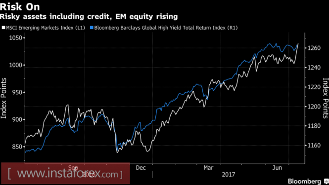 Глобальный аппетит к риску продолжает улучшаться, спрос на высокодоходные облигации, согласно индексу доходности Bloomberg-Barclays, устойчиво идет вверх и тянет за собой MSCI развивающихся стран.