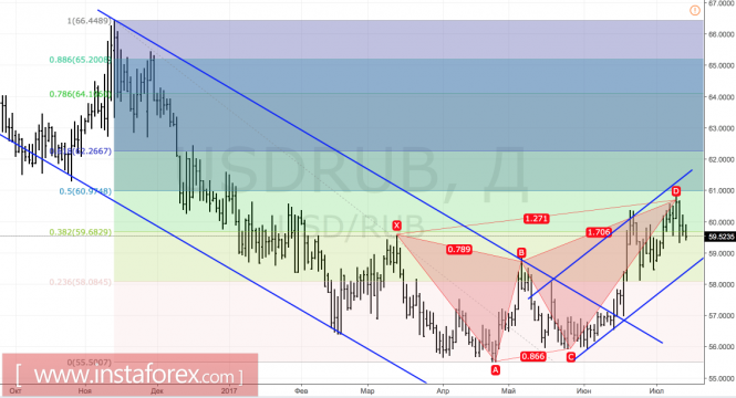 Технически, как и предполагалось, после достижения таргета на 127,2% по перевернутому паттерну «Идеальная бабочка» пошел закономерный отскок. Неспособность «быков» удержать котировки выше важного уровня 59,7 свидетельствует об их слабости и усиливает вероятность дальнейшего пике в направлении нижней границы восходящего торгового канала.