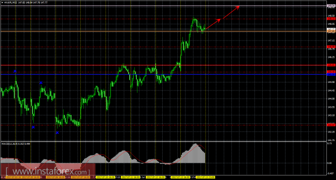 На 15-минутном графике рекомендуется рассматривать ордера на покупку с целями 148,33 и 149,04 (Сенкоу Спан Б) при закреплении цены выше 147,65 (Сенкоу Спан А), ордером Stop Loss ниже 147,65 и при направленном вверх индикаторе MACD.