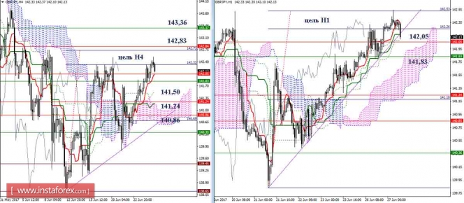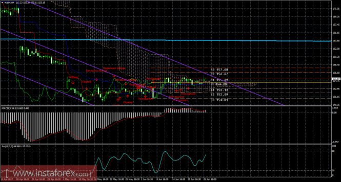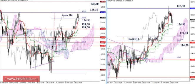 Индикатор MACD – красная линия и гистограмма с белыми барами в окне индикаторов.Материал предоставлен компанией InstaForex - www.instaforex.comДневной обзор GBP/JPY и EUR/JPY на 27.06.17. Индикатор Ишимоку