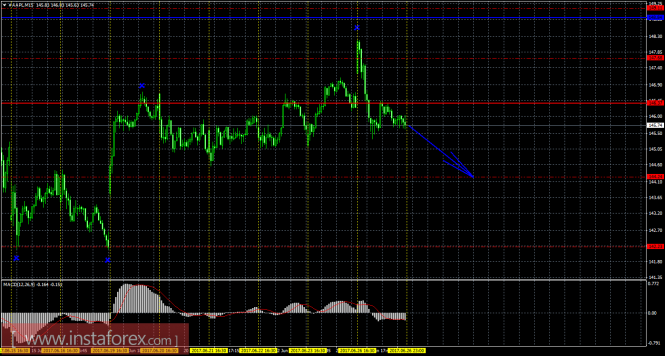 На 15-минутном графике рекомендуется рассматривать ордера на продажу с целью 144,24 при закреплении цены ниже 146,37 (Тенкан-сен), ордером Stop Loss выше 146,37 и при направленном вниз MACD.