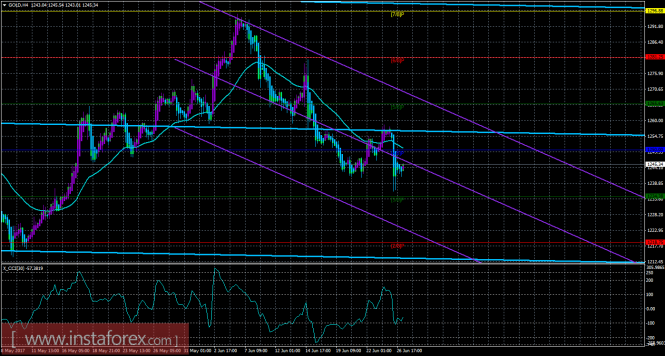Хайкен Аши – индикатор, окрашивающий бары в голубой или фиолетовый цвета.Материал предоставлен компанией InstaForex - www.instaforex.comТехническая картина инструмента GOLD по системе «Каналы регрессии» за 27 июня 2017 года