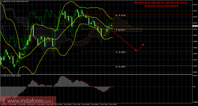 Красная линия и гистограмма с белыми барами в окне индикаторов.Материал предоставлен компанией InstaForex - www.instaforex.comТехнический анализ и торговые рекомендации по валютной паре USD/CHF на 27 июня 2017 года