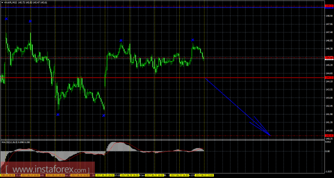 На 15-минутном графике рекомендуется рассматривать ордера на продажу с целью 140,45 при закреплении цены ниже 144,33 (Тенкан-сен), ордером Stop Loss выше 144,33 и при направленном вниз MACD.