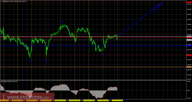 Индикатор MACD – красная линия и гистограмма с белыми барами в окне индикаторов.Материал предоставлен компанией InstaForex - www.instaforex.comТехнический и свечной анализ акций Apple на 23 июня 2017 года