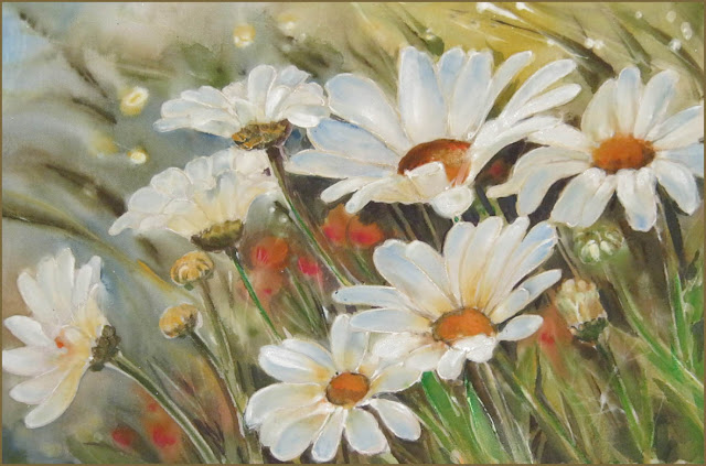 В этот раз я начинала не с цветов, а с фона. И хотя поле картины маленькое и проще было бы покрыть всё очень ровненько, но вы же знаете, как я это не люблю,ровные плоскости одним цветом - это всё похоже на детские раскраски. Поэтому слева - небо. Это голубое, чуть придушенное черной краской, справа - трава, листья,на фоне которых хорошо смотрятся белые ромашки.Стоп. Какие белые?. Они очень разноцветные. В лепестках голубой, синий, желтый, розовый.