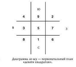 Каждый квадрат ассоциируется с направлением и содержит число. Это называется "диаграммой ло шу", или "первоначальным планом" и является основой школы Блуждающих или Летящих Звезд в искусстве фэн-шуй. Интересный аспект плана девяти квадратов заключается в том, что вы можете сложить любые три числа по прямой линии - вверх, вниз, поперек или по диагонали - и всегда получите в сумме число 15. Диаграмма ло шу занимает почетное место во всех школах фэн-шуй, так как расположение чисел в ней отражает схему движения потоков энергии.