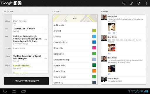 Приложение позволяет просматривать план мероприятий и отмечать понравившиеся, просматривать подробную информацию о выступлении (например, биографию спикера, фотографии и профиль в Google+), получать напоминания о предстоящих выступлениях, синхронизировать календарь с датами выступлений, стримить видео выступлений для Android Honeycomb+ и многое другое.официальном сайте.
