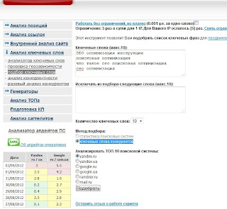 Прописываем, запросы которые нас интересуют. Возьмем как пример: SEO оптимизация инструкция,поисковая оптимизация,что такое сео поисковая оптимизация и еще сео оптимизация. Я выбираю, ключевые слова конкурентов, количество слов 10, анализ в Яндексе См. фото 3
