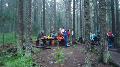 Дождь шел почти не прекращаясь. Казалось, что на небе подвесили марлю и пропустили через неё небесную воду. Временами дождь усиливался... Но удивительно - лица участников были светлы, голоса веселы, походка бодра... В предгорье сейчас установлен кардон, там мы оплатили туристический взнос.