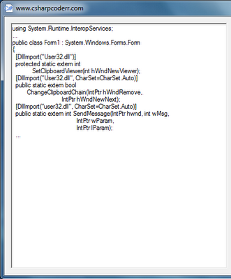 ![]() ОС Windows поддерживает список, или цепь, приложений, которые обратились с просьбой получить уведомление, когда данные поступят в буфер обмена. Каждый раз, когда в буфере обмена изменяется данные, первое приложение в этой цепочке получает сообщение - WM_DRAWCLIPBOARD. Приложения могут запросить тип данных в буфере обмена, например RTF, ASCII текст, и так далее. Так как нет управляемых (. NET) API для добавления приложения в цепочку, чтобы получать уведомление об изменении буфера, вы должны использовать Win32 SetClipboardViewer. Вы должны знать некоторые общие правила при использовании этой функции. • При вызове SetClipboardViewer, вам необходимо пройти дескриптор окна, которое будет получать сообщение WM_DRAWCLIPBOARD. SetClipboardViewer функция возвращает текущее первое приложение в цепочке. Ваше приложение должно хранить в классе членов, потому что каждое приложение которое получает сообщение WM_DRAWCLIPBOARD может отправить то же сообщение к следующему приложению в цепочке (через функцию SendMessage). • WM_CHANGECBCHAIN. Поскольку каждое приложение, которое обрабатывает WM_DRAWCLIPBOARD, отвечает за отправку этого сообщения к следующему приложению в цепочке, оно также должно знать, когда изменилась цепь. Буфер обмена посылает сообщения WM_CHANGECBCHAIN , когда приложение удалило себя из цепочки. • При завершении работы необходимо удалить приложение из цепочки. Эта задача решается с помощью Win32ChangeClipboardChain функции, и это может быть сделано в любое время, буфер обмена мониторинга больше не нужен. Для работы вам понадобится разместить компонент richTextBox. Так же в его свойствах ForeColor указать цвет Black! Вот код приложения: IntPtr nextClipboardViewer;
