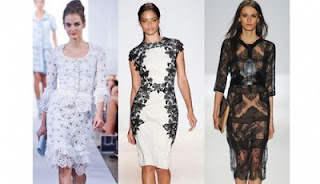 Для создания нарядов модельеры в этом году используют не только полупрозрачную кружевную ткань, но и комбинацию этого материала с более яркими контрастным. Оригинальные платья, юбки и блузки, выполненные путём наложения кружев на однотонное или пёстрое насыщенное полотно, выглядят очень эффектно и модно.
