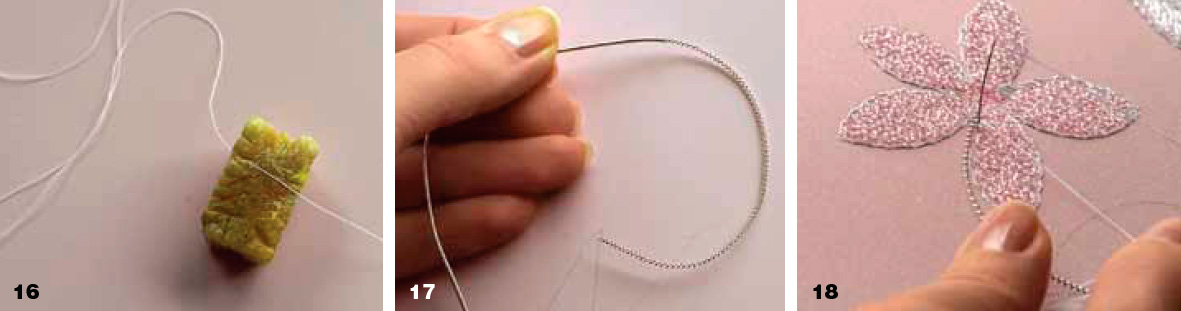 6. Переходим к обшиванию краев цветка. Для начала обработаем нить воском. Положите нить на небольшой кусочек воска (илл. 16), слегка прижмите ее и протяните по поверхности куска. Игла для пришивания канители должна быть тонкой и короткой.