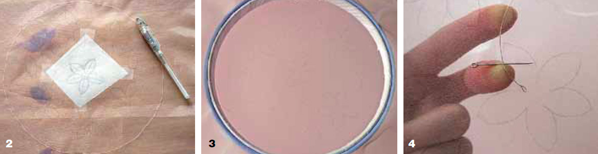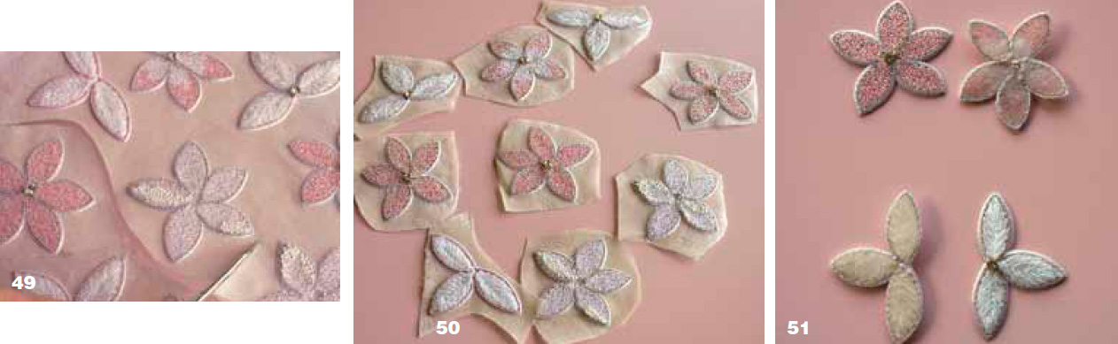 9. Проклеиваем металлик-органзу флизофиксом, накладываем клейкой стороной на изнанку, обкалываем булавками вокруг каждого цветка (илл. 41) и трилистника (илл. 42) и обшиваем белой шелковой нитью табмурным швом каждый цветок и трилистник (илл. 43—46) дважды (схема а—6). Пришиваем камни/бижу на розовые цветы и на все трилистники, снимаем булавки (илл. 47) и еще раз делаем тепловую обработку маленьким утюгом (илл. 48).