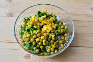 Выложить подготовленные продукты в миску. Добавить зеленый горошек и кукурузу.