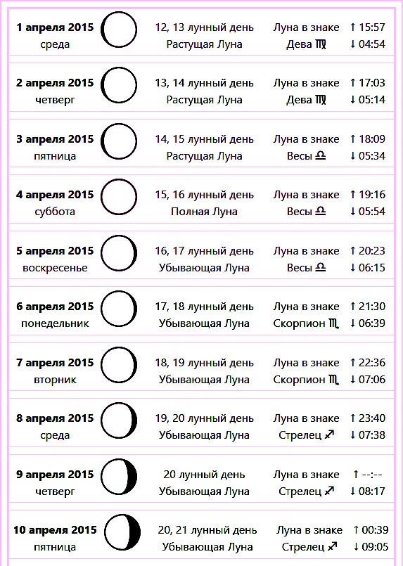 Лунные дни, фазы луны по лунному календарю в апреле 2015 года