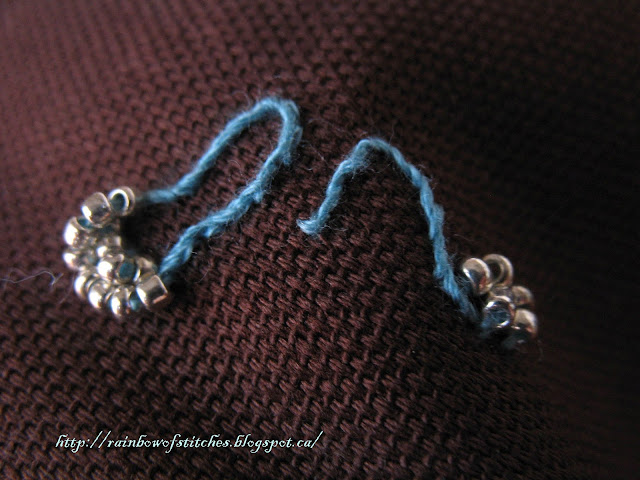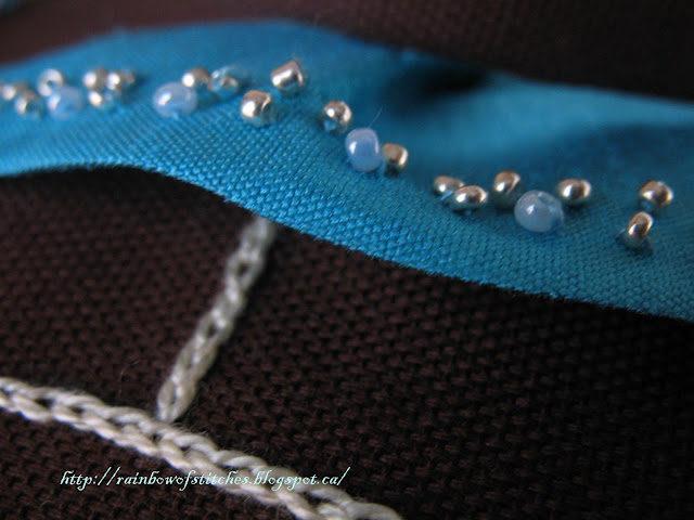 This design uses:applique, beading, black stitch, stem stitch, whipped chain stitch