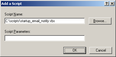Нажимаем кнопку «Add...». Во вновь отрывшемся диалоговом окне «Add a Script» задаем полный путь к нашему скрипту email_notify.vbs. Официально рекомендованный путь для размещения загрузочных скриптов — «C:\WINDOWS\system32\GroupPolicy\Machine\Scripts\Startup».