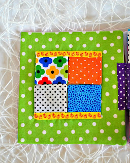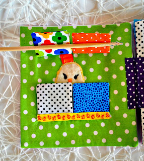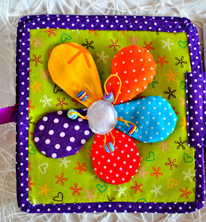 В книге использовала много разных интересных и фактурных тканей , для троганья и рассматривания. Много шуршащих элементов, в лепестках цветочка зашиты различные наполнители.