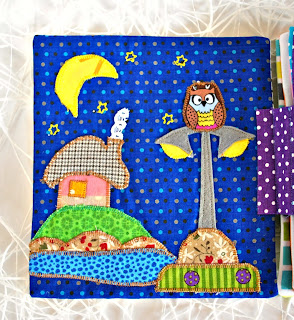 Страница Ночь – сказочная. Можно рассматривать, трогать считать вышитые звездочки, месяц, дымок из трубы.