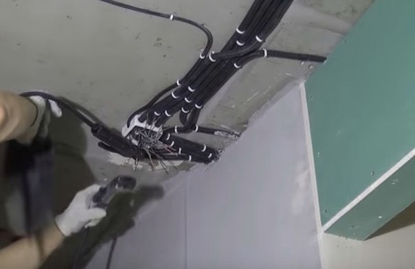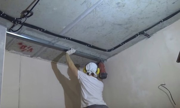Монтаж потолка с светодиодной подсветкой и точечными светильниками из гипсокартона.